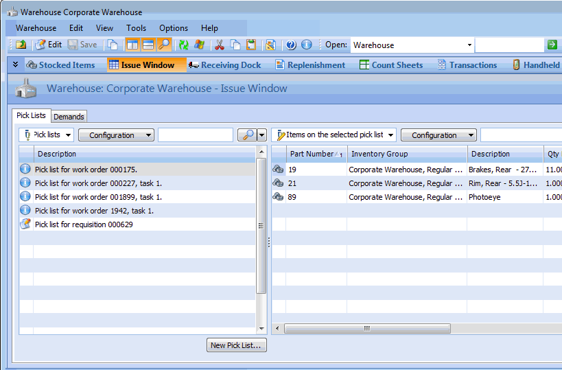 Concepts Tasks Settings Opening a Pick List You can open a pick list from the warehouse that it was created for. To Open a Pick List 1. In the Site window, select the Resource Management view and then the Inventory tab. 2. On the Warehouses tab, double-click the warehouse. The Warehouse window appears. 3. Select the Issue Window view, Pick Lists tab. APM lists the open pick lists for the warehouse. Tip: To see a list of all pick lists, select the All Pick Lists configuration. 4. Double-click the pick list. APM opens the pick list window.
