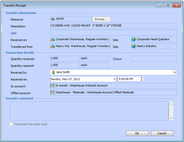 4. Right-click the item that you want to receive and select Receive Transfer. The Transfer Receipt dialog appears.