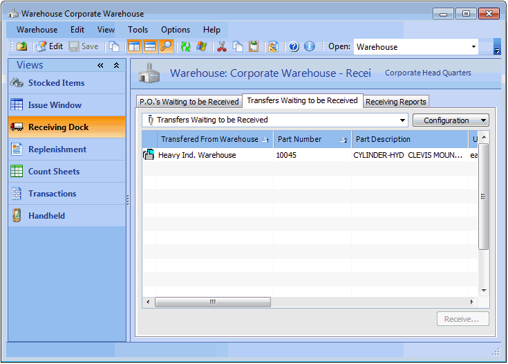 3. Select the Receiving Dock view, Transfers Waiting to be Received tab. This tab lists all pending warehouse transfers to this warehouse.