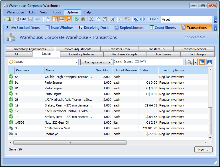 Tip: To view transactions for the site, select the Resource Transactions view and the Materials tab. You will find tabs listing issues, returns, receipts, adjustments, transfers, transfer receipts, and repairs. Select the All tab to view all material transactions. Select from configurations that order the list by date or resource, with and without details.To View Inventory Transactions for a Warehouse