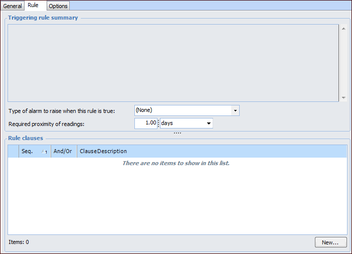 9. On this tab, you can set up a triggering rule. A triggering rule consists of one or more clauses. To create a clause for the rule, click New. The Rule Clause dialog appears.