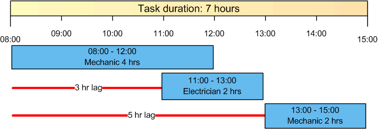 Resource demand lags allow you to delay the planned start time of an individual requirement (such as a trade, service, or tool) as it relates to the task’s planned start date. For example, you could enter a trade requirement for an electrician, and set it to start two hours after the task is planned to start.Requirements that Support Lags