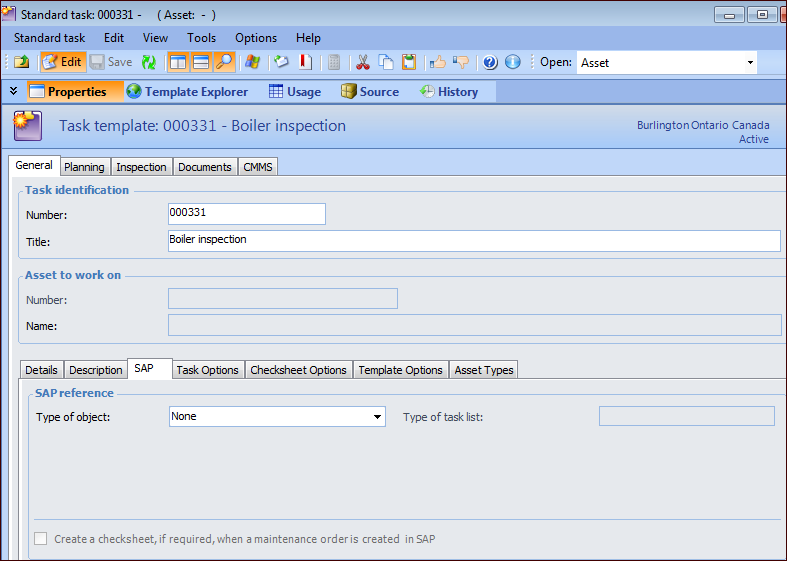 7. The option Create a checksheet, if required, when a maintenance order is created in SAP is selected by default. A checksheet is generated from the standard task when a maintenance order is created in SAP that is based on the linked task list. You can clear this option to disable the functionality for the standard task.Tip: In the Standard Task window, select the SAP Properties view to see detailed information about the linked task list.