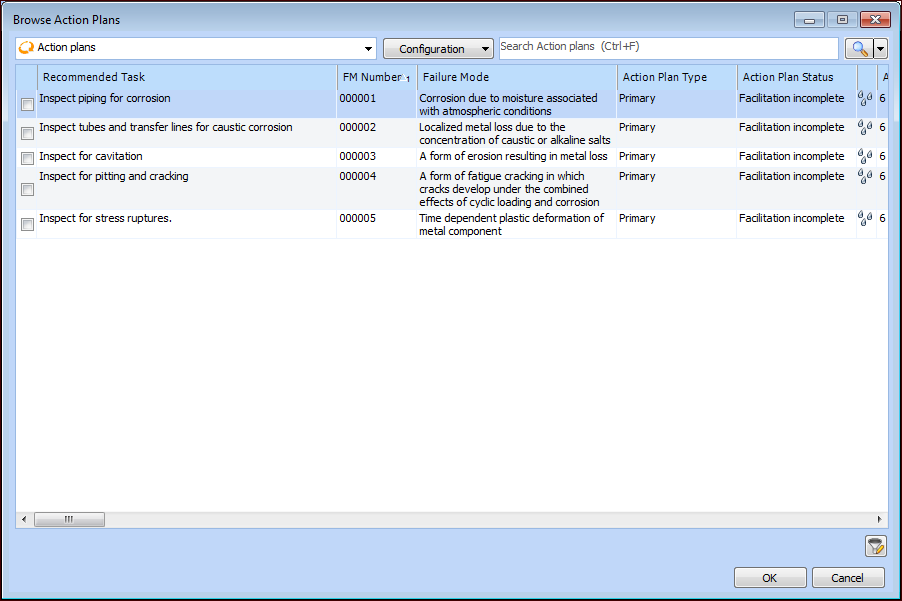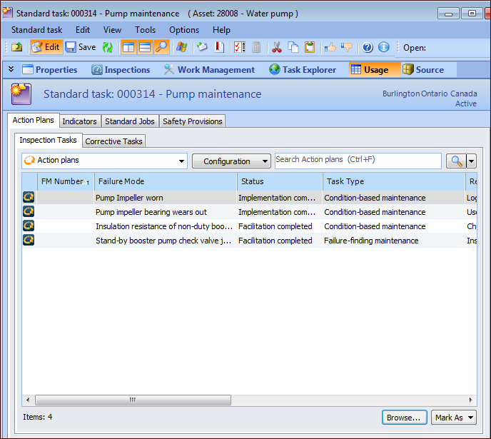 1. Select the Usage view, Action Plans tab, Inspection Tasks tab to view the actions plans that reference the standard task. For example:Tip: You can double-click an action plan’s icon to open the Maintenance Action Plan window. Select the Implementation view to see the inspection task reference on the Inspections tab.