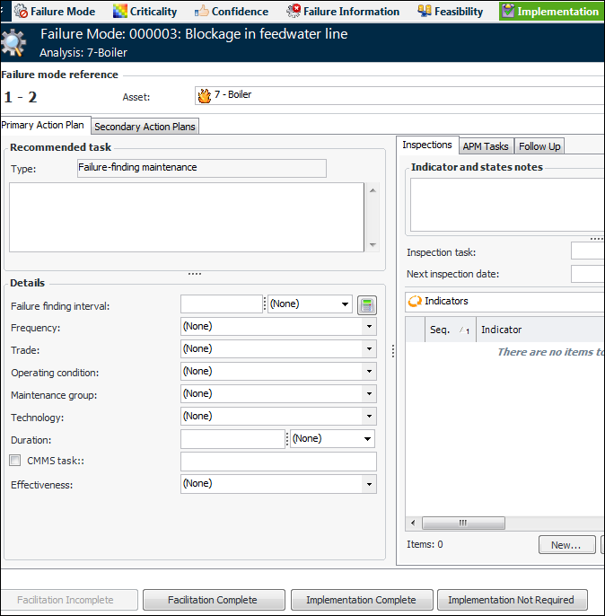 1. In the analysis’ Facilitation view, double-click the failure mode to open the Maintenance Action Plan window.