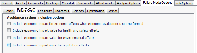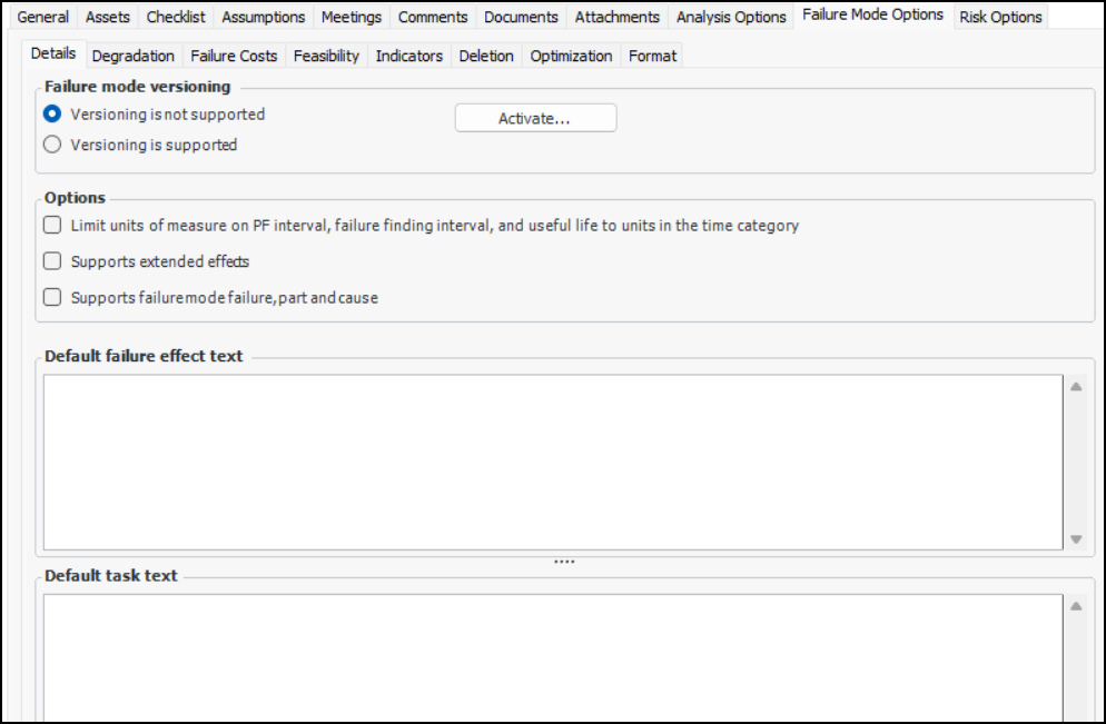 6. In the Default task text box, you can enter text that will automatically appear in the Task boxes for new failure modes.To Set Failure Cost Options
