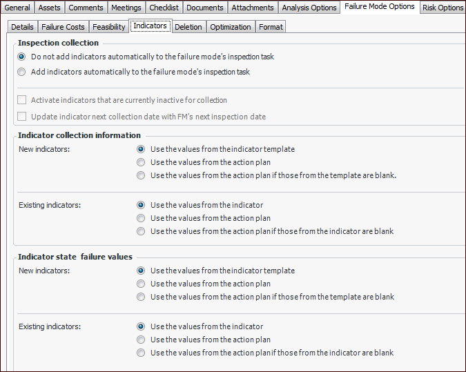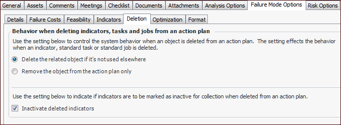 • Add indicators automatically – when an inspection task is added, indicators currently on the action plan are added to the standard task. When indicators are later added to the action plan, they are automatically added to the standard task.To enable this functionality, select Activate indicators that are currently inactive for collection.To enable this functionality, select Update indicator next collection date with FM’s next inspection date.To Set Deletion Behavior Options