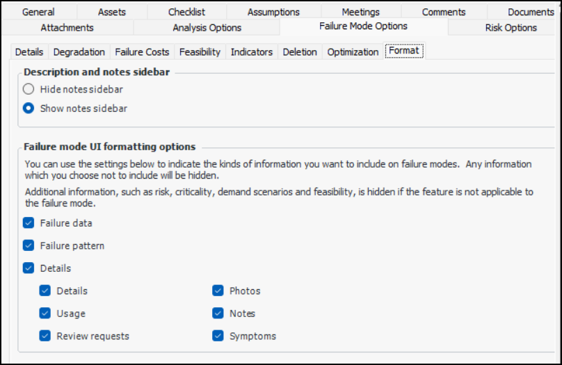 • Hide or show the Failure mode note sidebar in Maintenance Action Plan windowsTo Set Failure Mode Details