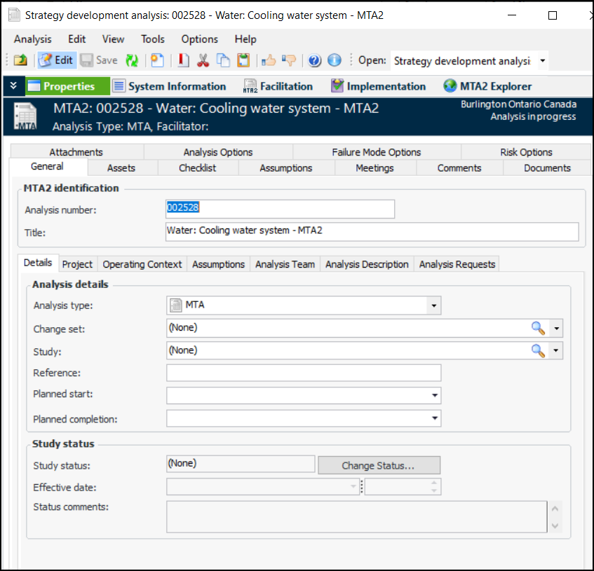 11. To set the general properties of the analysis, select the Properties view. The General tab displays information about the analysis. For example:Tip: The Optimization view is available if you are using the Isograph Availability Workbench (AWB) to analyze and optimize the data in failure modes. You can then import optimization results into the analysis, review the recommendations in the Optimization view, and make appropriate changes to the action plans.For information about using this functionality, see APM Integration Guide for Isograph Availability Workbench.