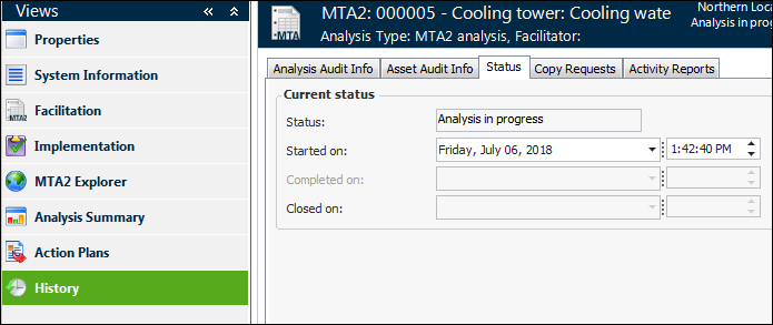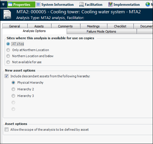 30. The New asset options area shows the settings you selected on the New Analysis dialog when creating the analysis. If you intend to add assets, you can select a different hierarchy.On the Assets tab, you can provide a description of the scope covered by the analysis. The same asset can be added to the analysis as many times as required. For more information, see Working with Asset Scope on an MTA2.