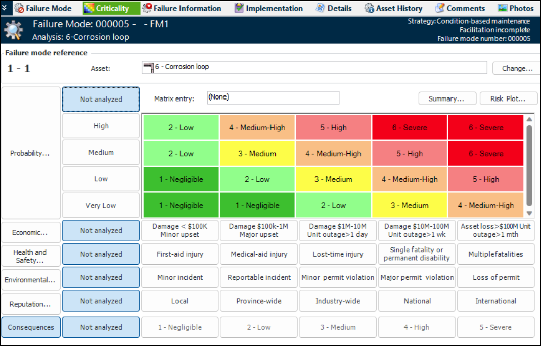 5. Viewing the Risk Summary – You can view the most recent evaluation results by clicking Summary on the Criticality tab. The Risk Summary dialog displays tabs for each of the questionnaires used in the analysis.If the appropriate option is enabled in risk analysis settings, the selected entry in the risk matrix sets the recommended task in the primary action plan (select the Implementation view). Condition-based maintenance with or without a frequency can be recommended, as well as modification/redesign.Tip: You can export criticality evaluations for all the analysis’ failure modes to a Microsoft Excel® file. Then add data to the file and import it back into the analysis. For more information, see Importing Criticality Evaluations into Failure Modes.To Evaluate the Probability of Failure