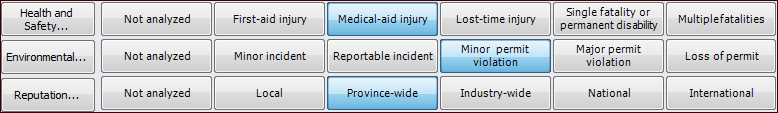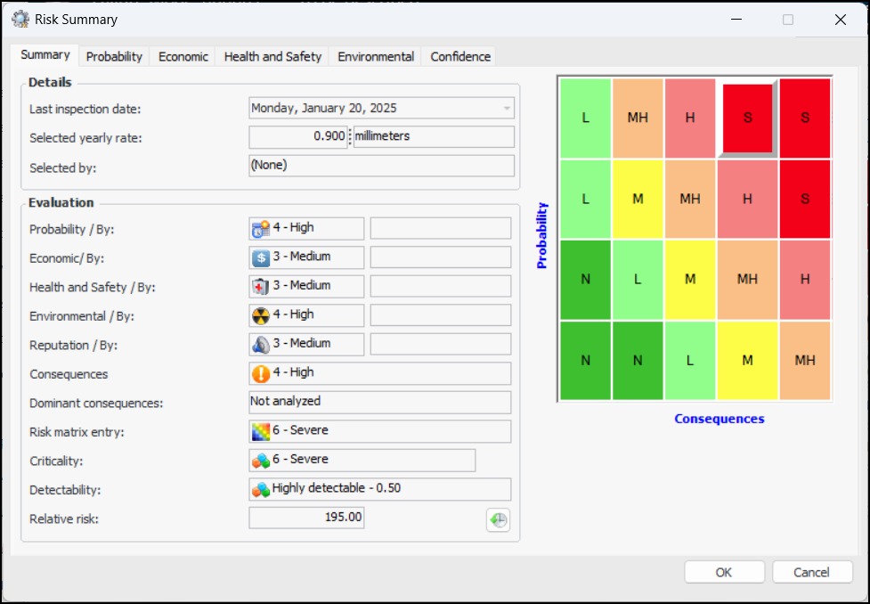 9. When you have completed the evaluation, click OK. The evaluation form closes and the result (for example, high, medium, low, or negligible) is selected in the risk matrix. For example:To Evaluate Economic Effects of Failure