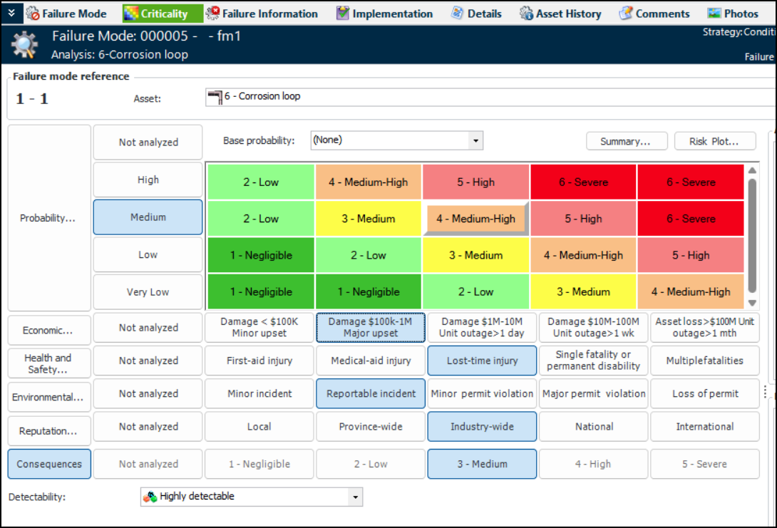 1. In the Criticality view, select the appropriate value from the Detectability list below the risk matrix. This number is used in the relative risk calculation.Viewing the Risk Summary