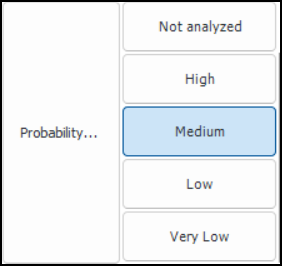 6. Complete the evaluation, selecting options for each category, entering notes, and using the arrow buttons to move between categories. If different evaluation types have been defined in the form’s design, you can select Simple or Detailed, as required by the complexity of the failure mode that you are analyzing.As you move through the analysis, the Probability box displays the most severe probability assigned to your selections. For example, if you select options for three categories, two of which have a result of “Negligible” and one with a result of “High”, the score for the evaluation as a whole will be “High”. This will be the probability used in the risk analysis.
