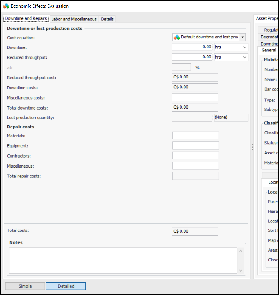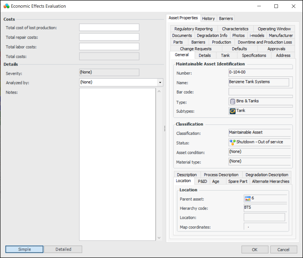 3. To perform a more detailed evaluation, click Detailed. Here is an example of a detailed form:As information is added to the form, APM calculates the total costs for the failure and displays the Severity score. All monetary amounts are shown in the site’s currency.