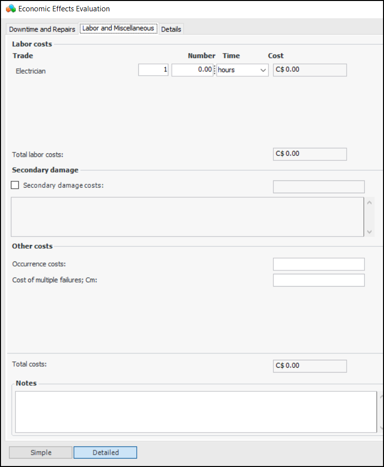 7. Enter information to calculate labor costs. The number and types of trades listed in the Labor costs area are defined in the Economic Evaluations settings. They vary depending on the trades defined for the site and selected for the evaluation. For each trade, enter the amount of time required to respond to the failure. APM calculates the cost based on the trade’s rate.