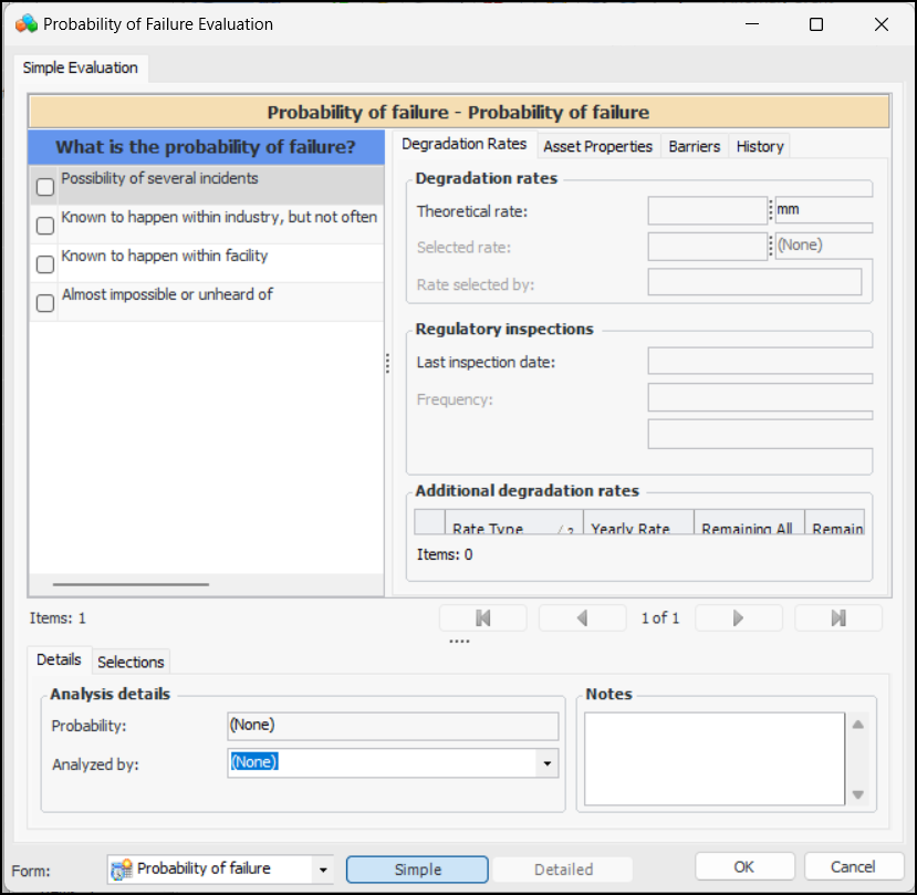5. To use a questionnaire, click Probability. The Probability of Failure Evaluation appears. The evaluation types (Simple, Detailed), categories, and questions available to you depend on the form’s design and the asset properties. Here is an example of a simple evaluation:You can refer to the History and Barriers tabs for information to aid in the evaluation, for example, historical inspections, failures, and work.
