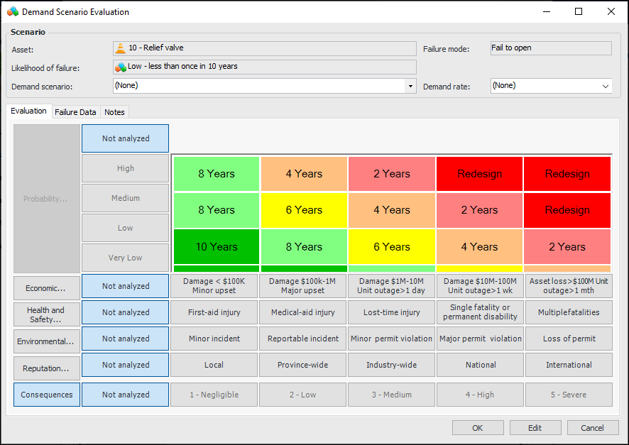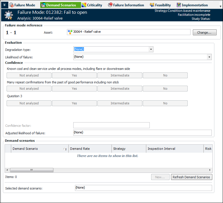 Note: Before you can perform demand scenario analysis, the likelihoods of failure, confidence questions, demand rates, demand scenarios, and probability matrix must be set up in the site’s strategy development settings. For more information, see Failure Probability Settings.To View the Failure Mode’s Settings