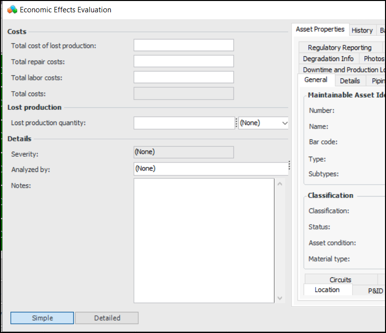 3. To perform a more detailed evaluation, click Detailed. Here is an example of a detailed form:As information is added to the form, APM calculates the total costs for the failure and displays the Severity score. All monetary amounts are shown in the site’s currency.