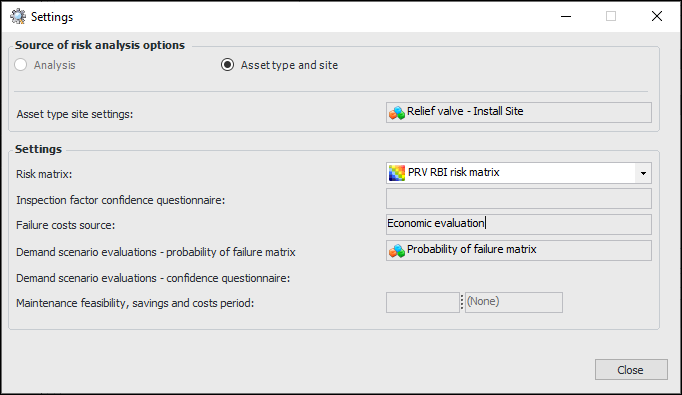 • The strategy development analysis. Risk analysis options can be set manually (Properties view, Risk Options tab) or defaulted from the analysis type assigned to the analysis.To quickly see where a failure mode derives its settings, click the Tools menu and then Settings. The Settings dialog appears, showing the source and settings. For example:To Evaluate Likelihood of Failure and Confidence