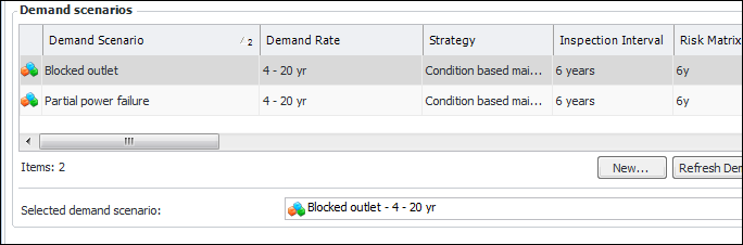 1. Click OK to close the Properties dialog. Back on the Demand Scenarios view, the scenario is listed in the Demand scenarios table. For example:The Selected demand scenario box displays the scenario with the highest criticality value.