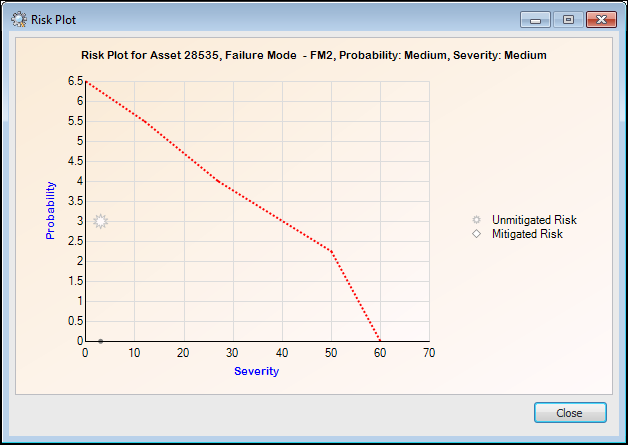 • Risk plot uses a single risk line – risk plot chart displays a line to indicate the failure mode’s initial risk. Select the chart line style from the list, for example, “FM risk tolerance line”. Here is an example of a risk chart with a single line: