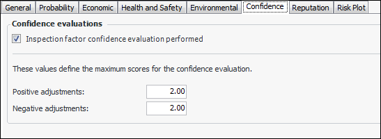 A confidence evaluation is performed to determine the inspection factor. This option is only relevant when risk analysis is performed using pop-up evaluation forms. The Confidence tab appears in the Maintenance Action Plan window.