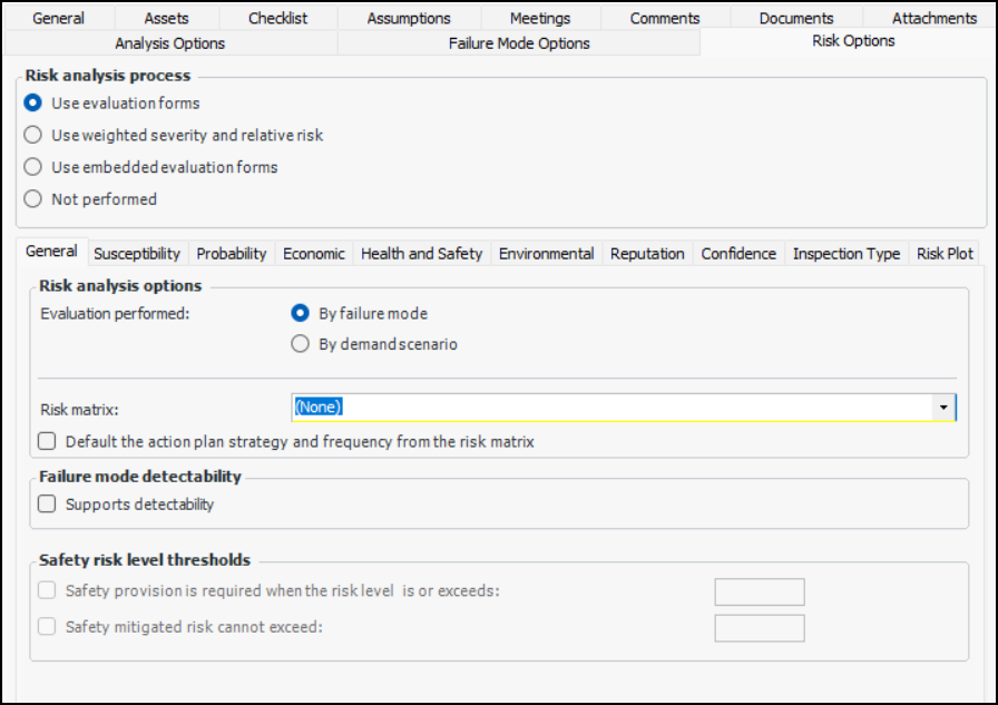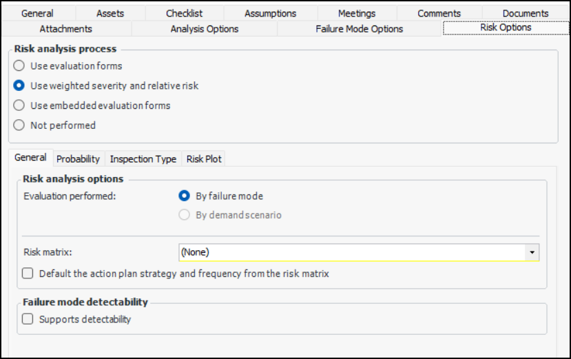 4. On the General tab, select whether risk analysis is performed on failure modes or on demand scenarios. If you select By demand scenario, the Demand Scenarios tab is added and the Probability tab is removed.