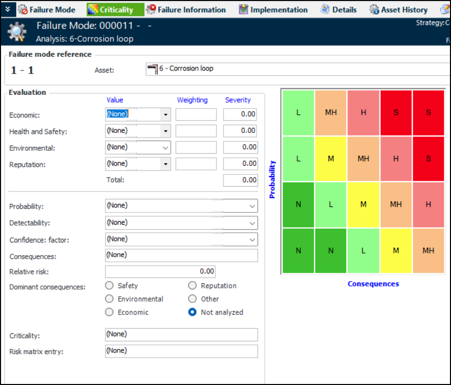 9. Select the most important consequence of failure from the Dominant consequences options.When you have performed risk analyses for all of the failure modes in the analysis, you can compare them using the Risk Analysis view. For more information, see Viewing Risk Analyses for MTA2 Failure Modes.