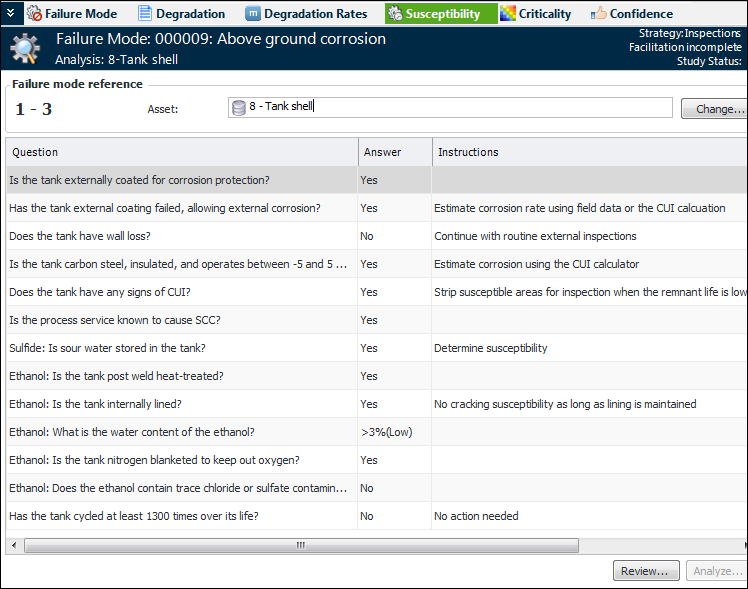Note: Before you can perform susceptibility evaluation, the questionnaire must be created and then selected in the analysis’ risk options. APM users with the Administrator privilege can create questionnaires in the site’s strategy development settings. For more information, see Setting up Susceptibility to Failure Questionnaires.To Evaluate Susceptibility to Failure