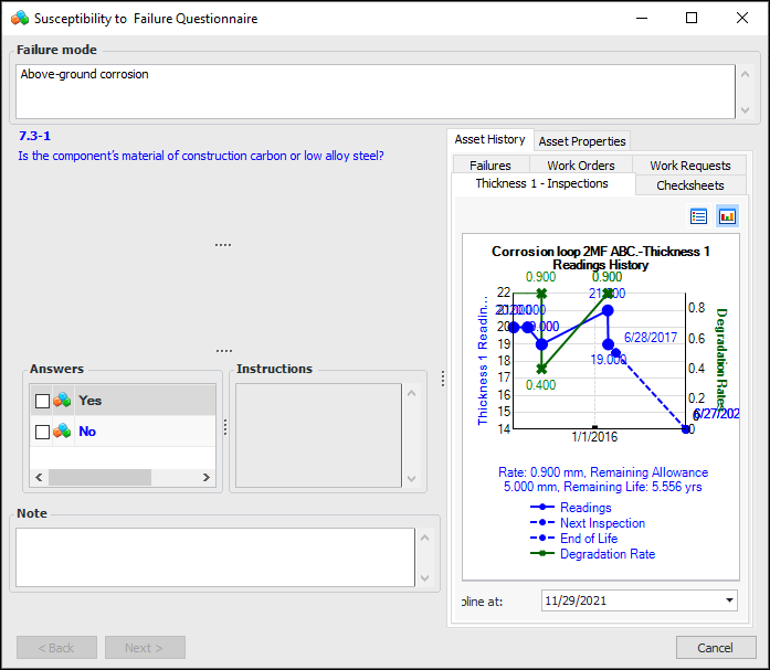 4. Click Analyze. The Susceptibility to Failure Questionnaire appears. For example:The Asset History and Asset Properties tabs display information about the analysis asset to aid in the evaluation.
