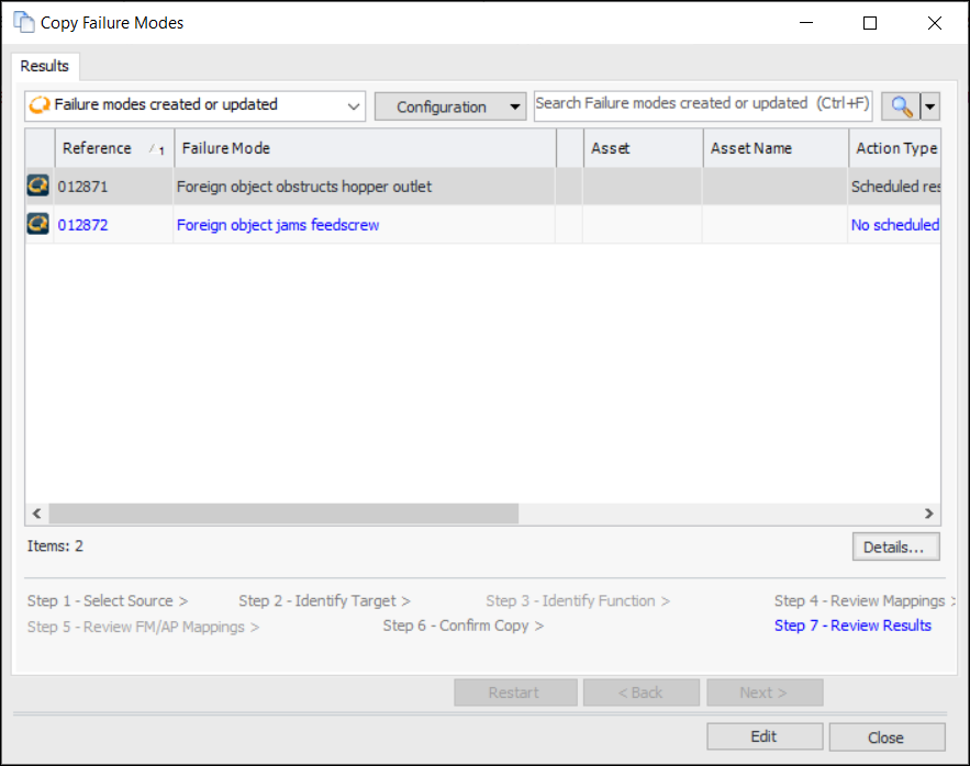 • If processing has not been deferred, the copy is completed. If Review results is selected, the Review Results step appears. For example:To view more information, click Details. The Details window displays information about the source and target asset structures, asset mappings, employees, trades, maintenance groups, failure modes, and so on. For example:When you are finished reviewing results, click Close. You can view the information again on the Copy Requests tab for the site or the analysis.