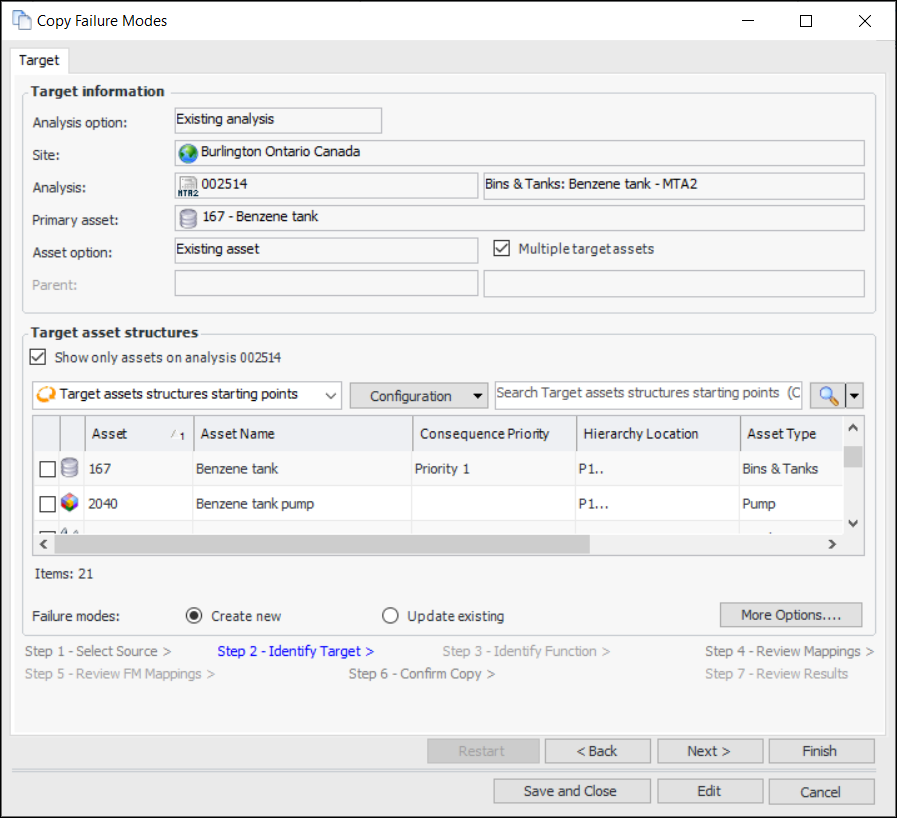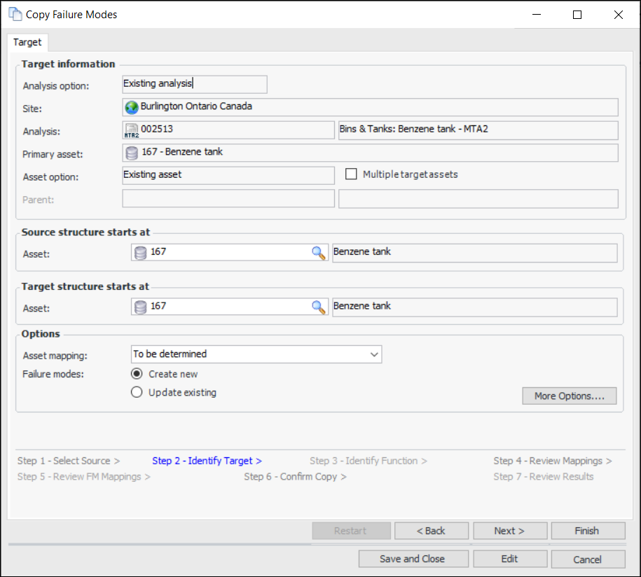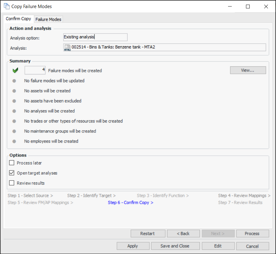 Tip: For quick copies (when you do not need to adjust the mapping options), click Finish when you have selected the source and the failure modes to copy. The wizard performs the matching process and goes to the Confirm Selections step. Skip to step 16.