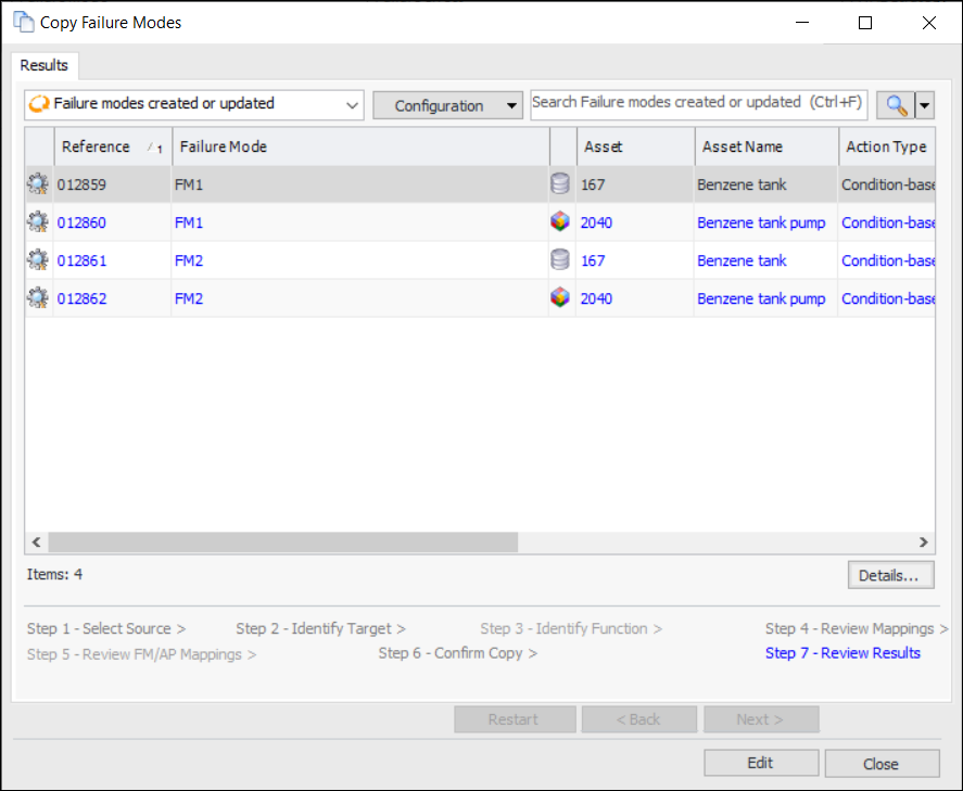 There are differences in the Copy Failure Modes wizard if you are copying from or to a template. The illustrations in the procedure show an analysis-to-analysis copy. Any differences in functionality for templates are explained where they occur.