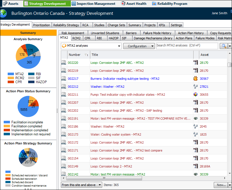 The Site window, Strategy Development view contains tabs that allow you to review all of the site’s strategy development analyses and to view failure modes for all assets. For example: