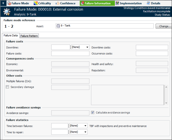 • You can manually enter costs on the Failure Information view if criticality evaluation is not performedIn the Failure Information view, the Failure Data tab displays the estimated downtime, downtime costs, downtime per occurrence costs, failure costs, cost of multiple failures, and secondary damage cost. This tab also shows the consequence costs, if supported by the analysis’ failure mode settings. The following example shows the results when the detailed economic evaluation has been performed, as well as the other consequence evaluations:When Calculate avoidance savings is selected, APM sums the following values to arrive at the savings:On the Failure Pattern tab, you can record random, wear out, and infant mortality patterns. Typically, you will include information about failure patterns when you intend to use Isograph Availability Workbench to analyze and optimize action plans.To Record Failure Data