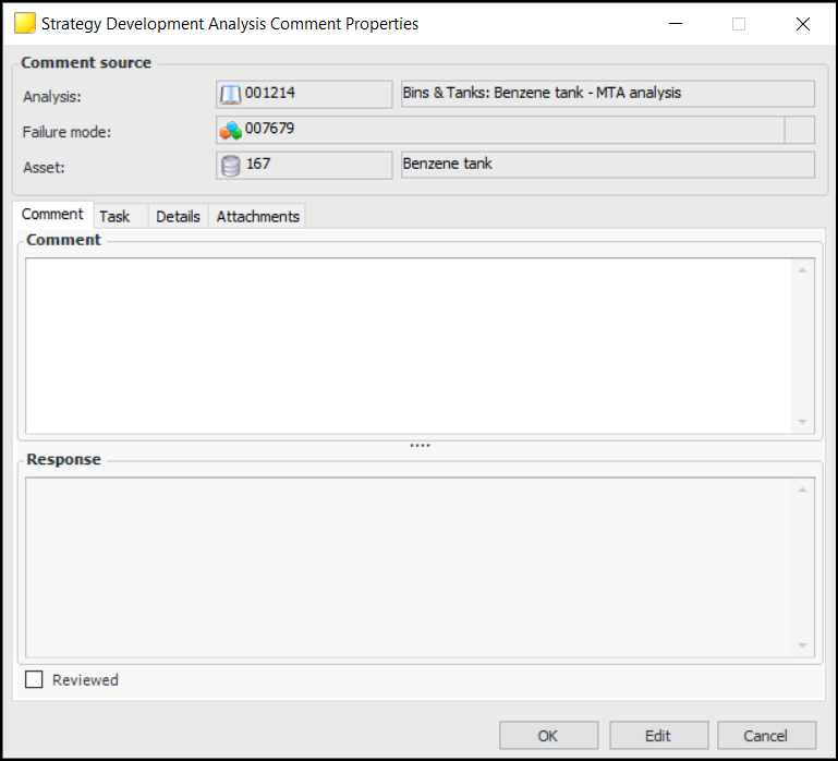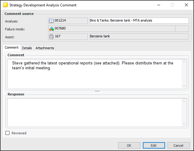 2. Click Edit to modify the comment, add a response, or mark the comment as reviewed. You can also add attachments and view details about the comment’s history.