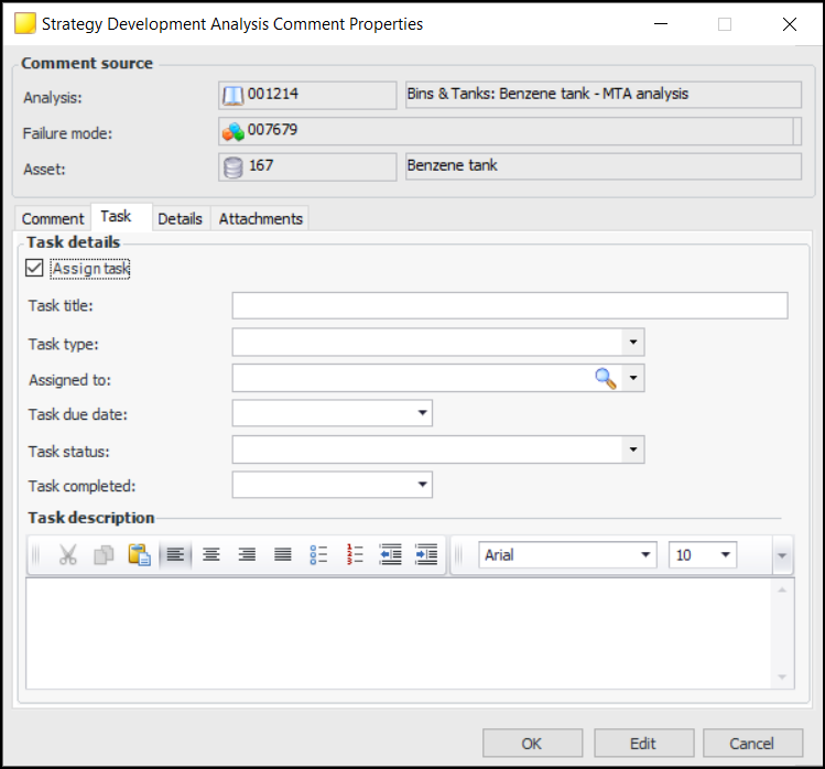 2. Click New to add a comment. The Strategy Development Analysis Comment window appears, where you can record information and add attachments. For example: