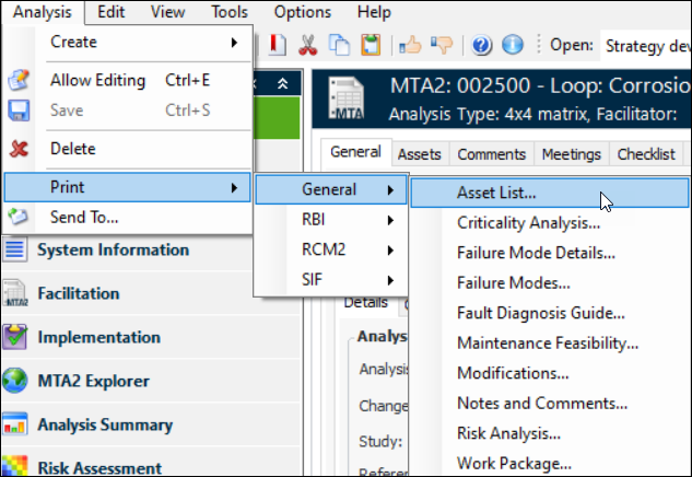 2. In the Strategy Development Analysis window, click the Analysis menu, Print, General, and then the report you’d like to print.Tip: You can also print a failure mode’s details report. Open the Maintenance Action Plan window, click the Failure mode menu, Print, and then Failure Mode Details.