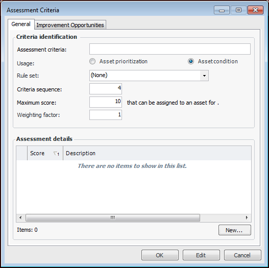 3. Click New. The Assessment Criteria dialog appears.