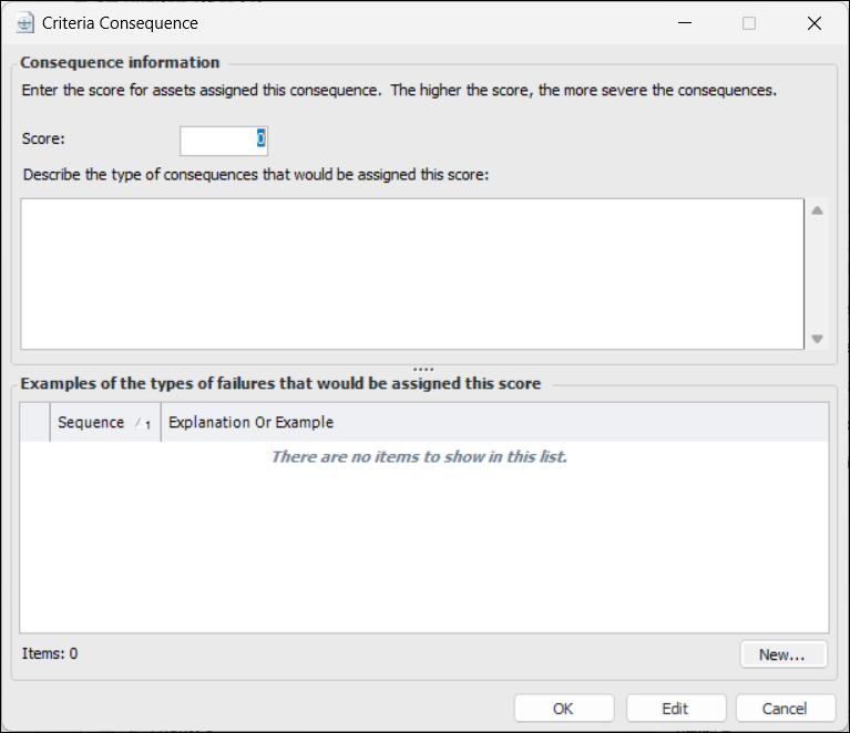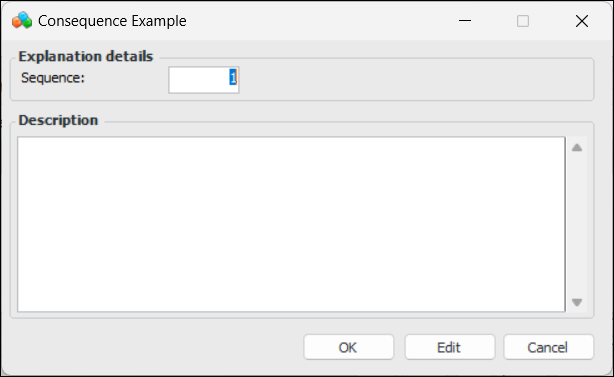 7. You can add an explanation or example to each consequence criterion to help users when entering scores. For each explanation you need, click New. The Consequence Example dialog appears: