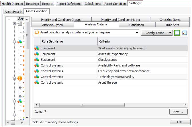 1. On the site’s Asset Health view, select the Settings tab, the Asset Condition tab, and the Asset condition settings node in the tree.Tip: You can also select the site’s Administration menu, Asset Health Settings, and then Condition Analyses. The Asset Condition Analysis Settings dialog appears.