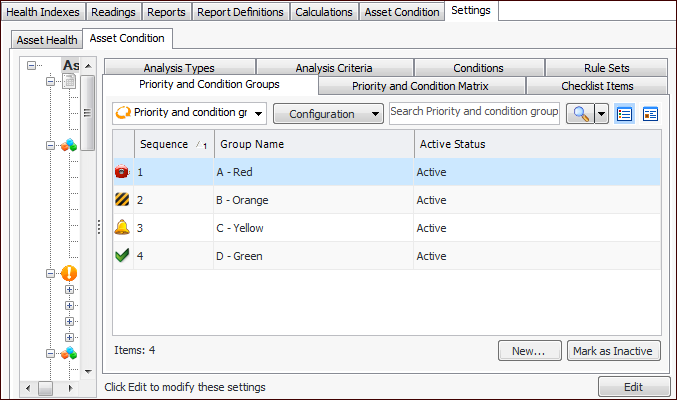 In the Site window, Asset Health view, Asset Condition tab, the Analyses tab offers configurations for viewing assets by priority and condition group as well as the priority and condition group summary.To Set up a Priority and Condition Group
