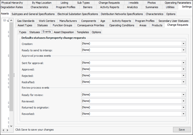 The status can be updated manually, by events in APM, or by AWEIS events. To ensure that the status changes appropriately in response to an AWEIS event, review the site interoperability profile. On the Change Requests tab, assign a status to each of the events. For more information, see Setting up Site Interoperability Profiles for AWEIS.To Set up Change Request Events