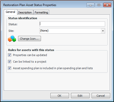 11. When you have finished defining the status, click OK. The status is added to the Asset Statuses tab.