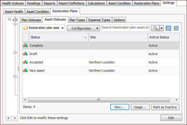 The status can also control whether or not the asset’s spending plan is included in the plan’s spending plan and lists. For example, plan assets with the “Accepted” status would usually be included in table configurations that show plan spending by financial period. These configurations are shown in the site’s or asset’s Asset Health view, Restoration Plans tab.
