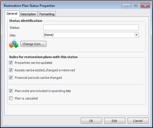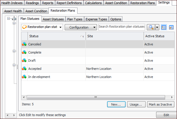 The status can also control whether or not the plan is included in lists. For example, plans with the “Accepted” status would usually be included in table configurations that show spending plans by financial period. These configurations are shown in the site’s or asset’s Asset Health view, Restoration Plans tab.