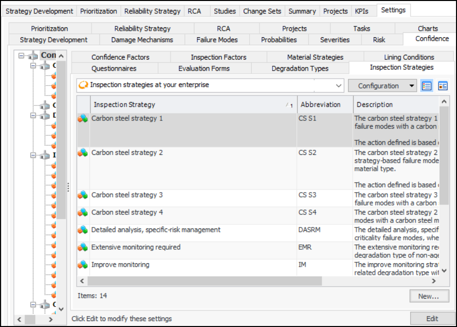 The inspection strategy describes the action to be taken in response to the failure mode’s criticality and confidence evaluations and its degradation type. An example is “Maintain current inspection / monitoring”. It is displayed in the Inspection strategy box on the failure mode’s Confidence tab.Tip: To view where an established inspection strategy is in use, double-click the strategy to open its Inspection Strategy Properties dialog. Click Where Used to view the failure modes, inspection factors, and inspection factor material strategies that use it.To Create an Inspection Strategy