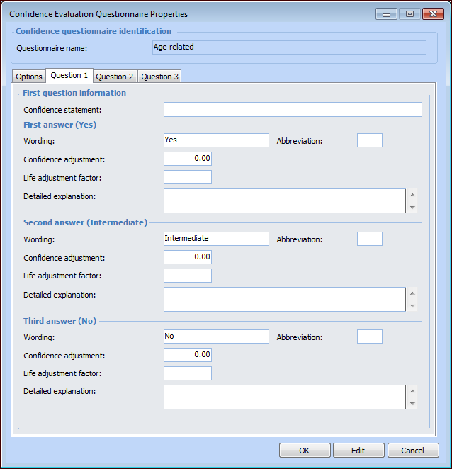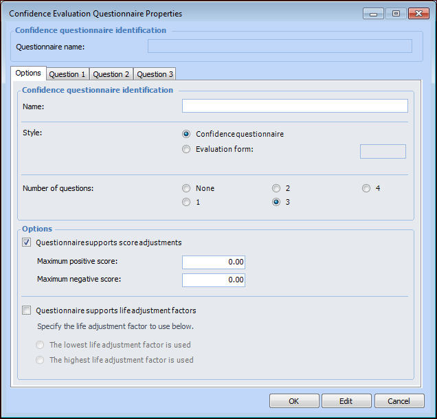 3. Click New. The Confidence Evaluation Questionnaire Properties dialog appears, for example: