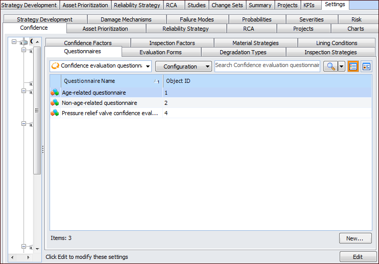 When a questionnaire is in use, the failure mode’s Confidence tab displays up to four questions. The analyst selects responses and APM provides the appropriate confidence or inspection factor.To Create a Confidence Questionnaire